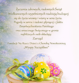 Życzenia zdrowych, radosnych ŚwiątWielkanocnych wypełnionych nadzieją budzącejsię do życia wiosny i wiarą w sens życia.Pogody w sercu i radości...